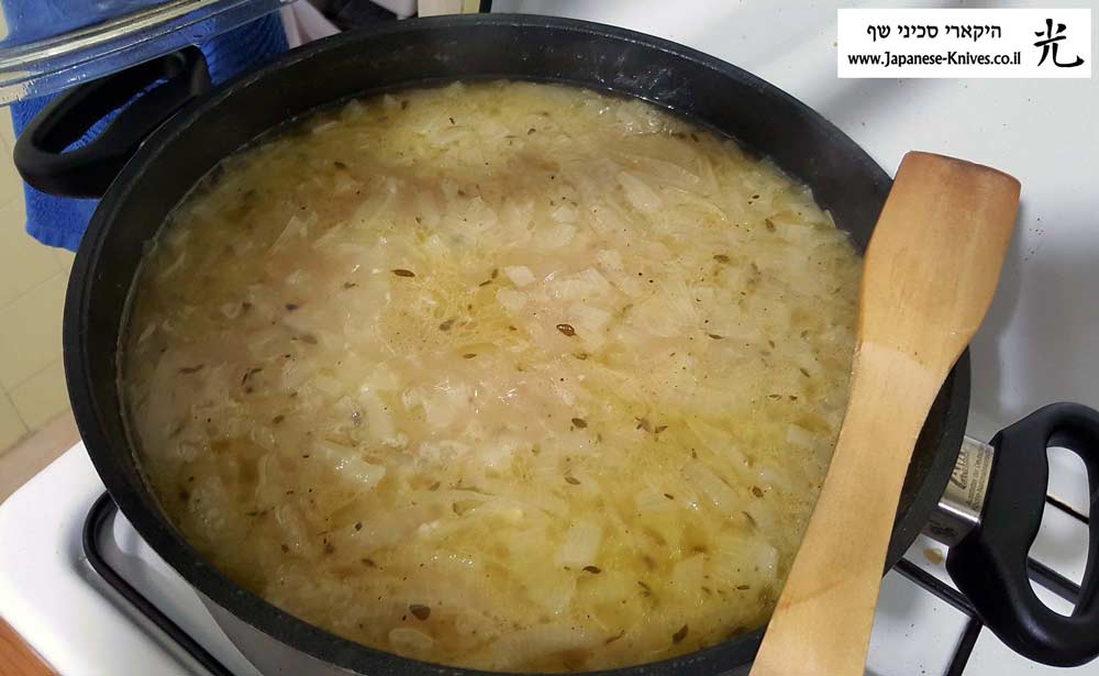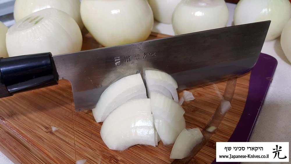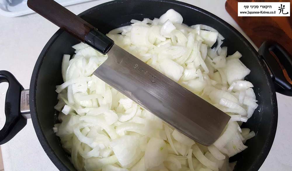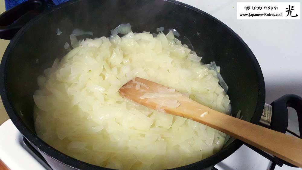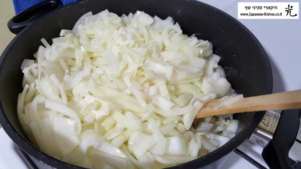 - יש לחתוך את כל הבצלים לרבעים ואז לפרוס אותם לפרוסות בעובי בינוני (מומלץ בעזרת סכין ירקות מסוג נקירי).